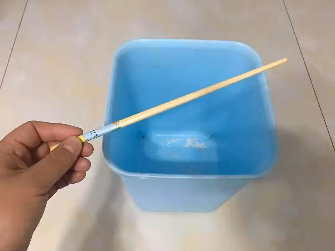 然後用熱熔膠把一次性筷子粘在垃圾桶的側面,兩根分別在兩側對應的位置,等待冷卻凝固。
