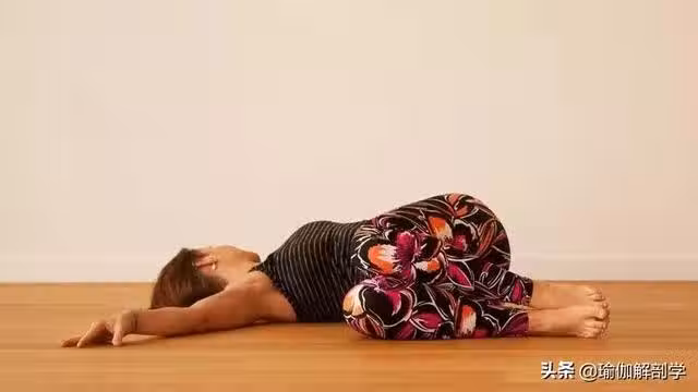 山式仰臥,手臂側平舉 屈雙膝,雙腿向右向下沉 扭頭向左,雙肩放鬆 停留5-8輪呼吸,換反側