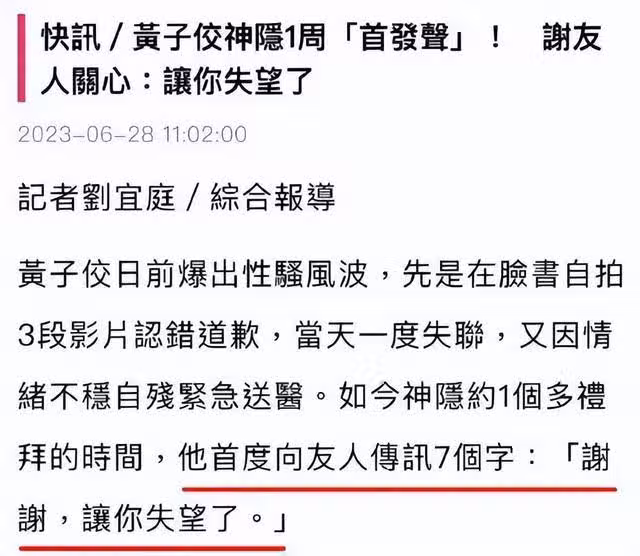 起初黃子佼只是承認自己冒犯別人,隨之就因為自我傷害被送進了醫院,正是藉助養傷的期間足足消失了將近一周的時間,讓自己有休養生息的機會,調整好自己後便放出一句話「謝謝,讓你失望了」引得吃瓜群眾深思,這到底是是什麼意思?