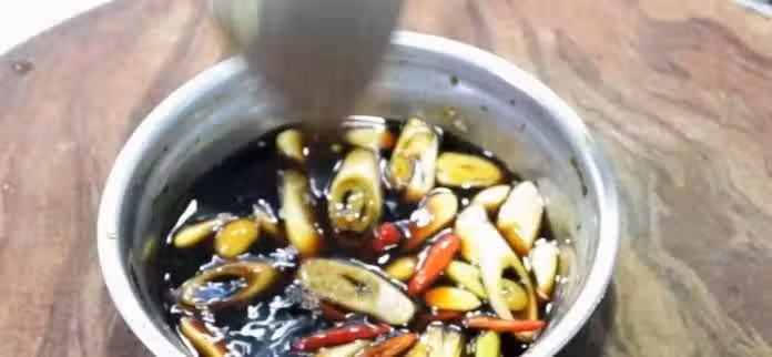 3.把蘿蔔醃好後擠乾水分,放入另一個盆中備用,在裝薑蒜的小盆中,加入味極鮮20克,生抽15克,陳醋25克,白糖20克,老抽3克上底色,用勺子攪拌化開。