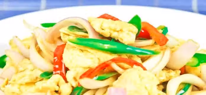 4.起鍋調味,加入食鹽2克,生抽5克,快速翻炒化開調料,把洋蔥炒至8時尚時,倒入雞蛋,快速翻炒10秒鐘,裝盤就可以了。