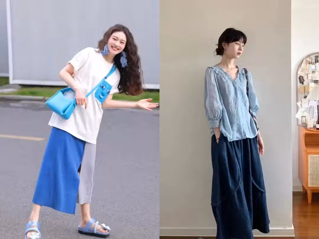 你可以像圖左的女生選擇藍白灰三種顏色的搭配,也可以像圖右女生的淺藍和深藍的搭配。 這兩種搭配方式都會顯得很有層次感,同時一身穿搭都很寬鬆舒適,很適合姐妹們日常穿搭。
