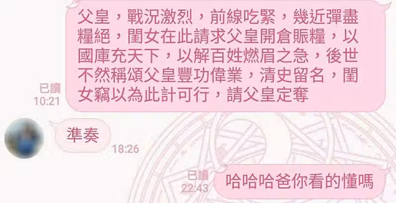 爸爸竟然也用文言文回說「 格格,汝之請奏,似有何處戰事不明之嫌,雖前方吃緊,後方緊吃,然國事繁難,綠黨作亂,吾國糧倉實已空虛,然格格處身前方,吾當竭盡倉底,亦將援軍於汝;不日即將抵達,尚請暫忍待援。」,讓女大生笑歪,覺得爸爸這麼久才回一定是在想該怎麼打,沒想到貼文曝光後,引起許多人效仿,有位男大生用同樣方式傳給爸爸,竟也得到搞笑的回覆!