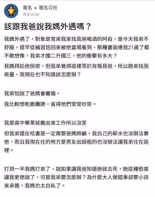 大部分網友都建議他:「做錯事的人是妳媽,讓她自己面對。」、「會喊要死的都不會死啦!嚇嚇妳們小孩而已...」但也有網友希望原PO為弟弟著想:「如果妳爸很愛妳媽,別講,妳媽應該會收斂,可以趁機談條件。」、「妳弟還小,鬧翻了對他影響很大,現在最需要的是安慰弟弟。」、「該給弟弟的生活費、教育費,妳媽要給,如果做不到就提告媽媽和外遇者。」