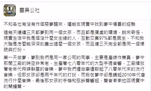 原本醒來後也不以為意,大約就是某種很一般的夢境,孰料隔天晚上,又夢到同一個女孩,這次兩人在很高的山上,在懸崖附近看著雲海,當時男網友心想,應該是之前去看雲海的記憶,被帶進夢裡面了,誰知道最後女孩突然拉著他的手,喊著:「我們走吧!」接著就一起跳下去,讓他整個人驚醒,夢中抓著的手原來是棉被,不過更讓他在意的是,已經醒來7、8秒左右了,還是可以聽到對方的聲音,心裡餘悸猶存。
