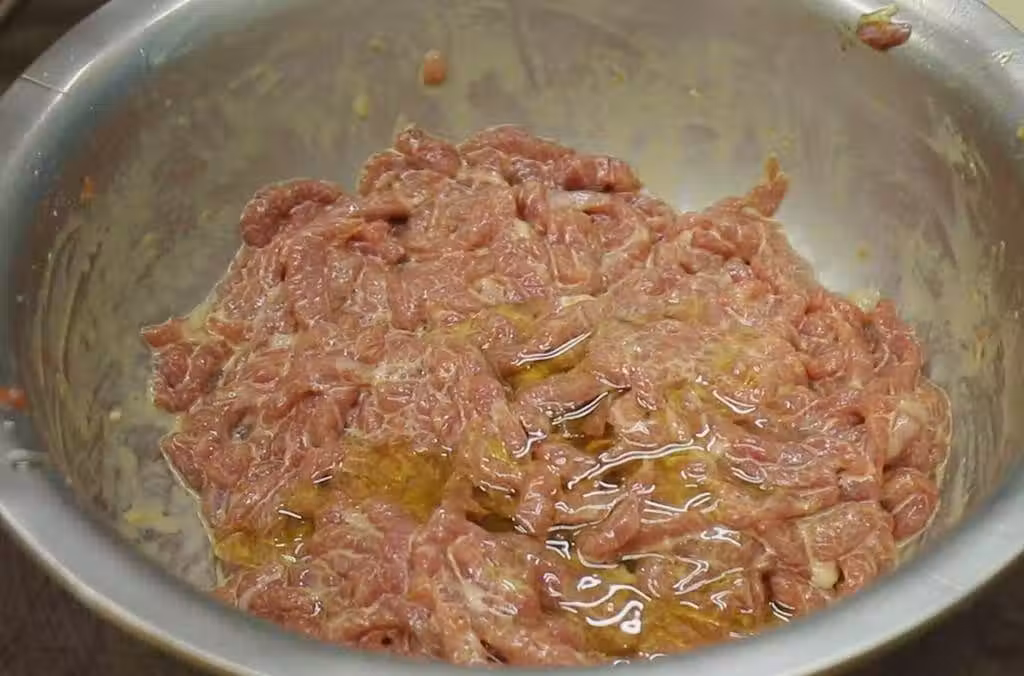 2、牛肉加鹽、雞粉、胡椒粉、蠔油、生抽,事先準備好的蔥薑料酒水也倒進去一些,順著一個方向快速攪打,讓牛肉絲吸收料汁以及蔥薑水,增加滑嫩感。然後磕進去一個雞蛋清繼續攪拌,再捏進去一小撮澱粉鎖住水分。最後用油封一下,放一邊腌制十分鐘。