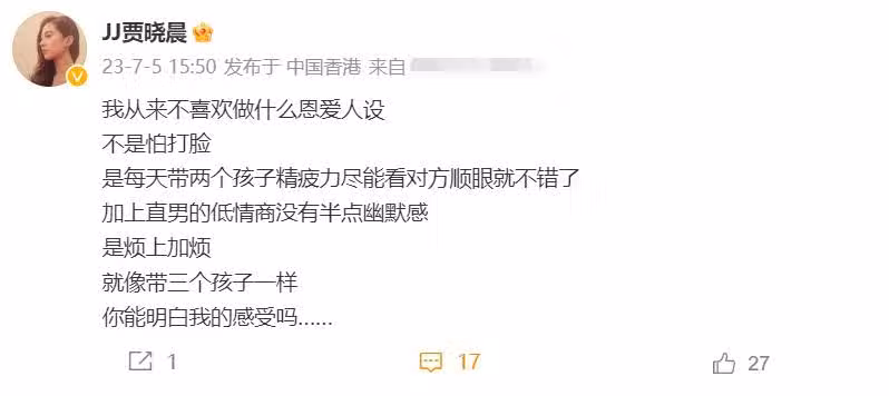 她感嘆道,真的很鬱悶,希望孩子快點長大。 看得出來,賈曉晨對於自己與樊少皇的婚姻生活,似乎有諸多不滿。而面對妻子的公開吐槽,樊少皇始終沒有發聲,自顧自忙著自己的生意。