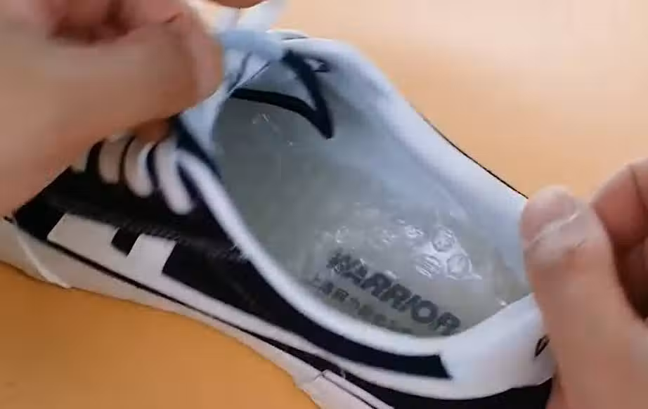 第四個妙用,防潮鞋墊。取一個鞋墊,對比著剪下氣泡墊,這個氣泡墊比較軟,不透風,不透水,剪成鞋墊的大小,把它墊到鞋子裡。上面在墊上鞋墊,冬天穿鞋走路,遇上下雨天,可以防水、防潮和保暖,避免打濕了襪子,踩著也軟軟的,很舒服。
