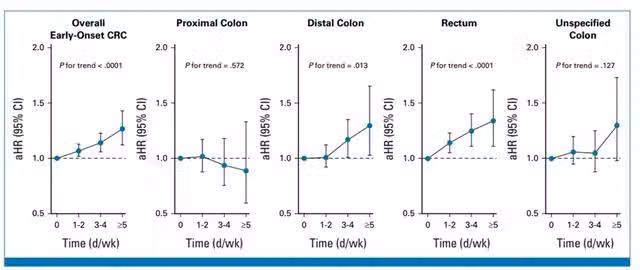 研究人員經過大量的數據分析與整合之後,得出來的結論是,相比於輕度飲酒的觀察對象,中度和重度飲酒的觀察對象發生早期結直腸癌的風險大大增加。