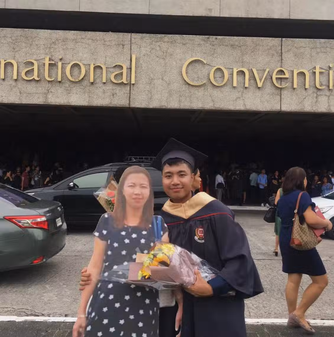 而為了完成媽媽的遺願!典禮當天Paulo John Alinsog帶著一塊「媽媽的1:1人形立牌」出席活動,讓早一步上天堂的媽媽也能共同見證他好不容易完成學業的光榮時刻~