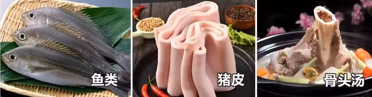 魚類:要說補充膠原蛋白的首選非魚類不可,它的膠原蛋白成分結構與人體最接近,也是人體最容易吸收的成分。所以不愛吃魚的,吃魚油也是不錯的選擇。