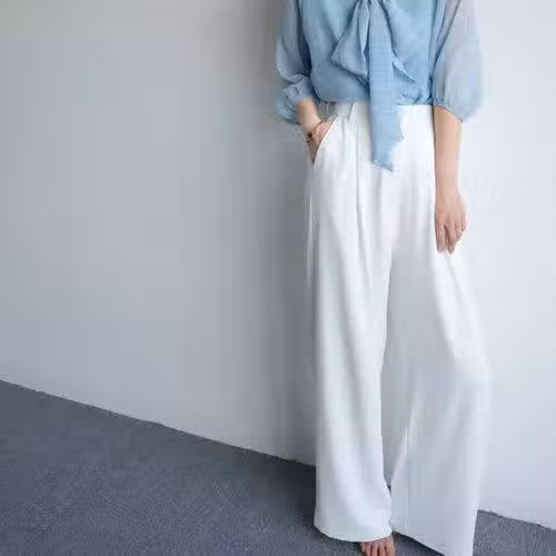 白色闊腿褲,散發出了十足的鬆弛氣息,而與藍襯衫的搭配中,也詮釋出了慵懶時髦的時尚姿態。當然從這位女士兩種不同的穿法中也能看出,扎一下襯衫衣角的話,可以更不費力的突出比例的優越感。