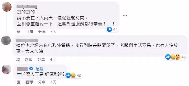 這篇文章在短時間就吸引5000多人按讚,很多網友紛紛留言為他打氣:「自食其力,這樣的態度令人動容」、「勇敢的先生加油!」「大雨就不要催單了,體諒外送員的辛苦!」「這位也曾經來我店取外餐過,我看到時差點要哭了。」「好堅強的正能量!」「他的生命力給了我很多啟發!」看來這位外送員堅強的身影,帶給很多人很深的感觸與啟發呢!