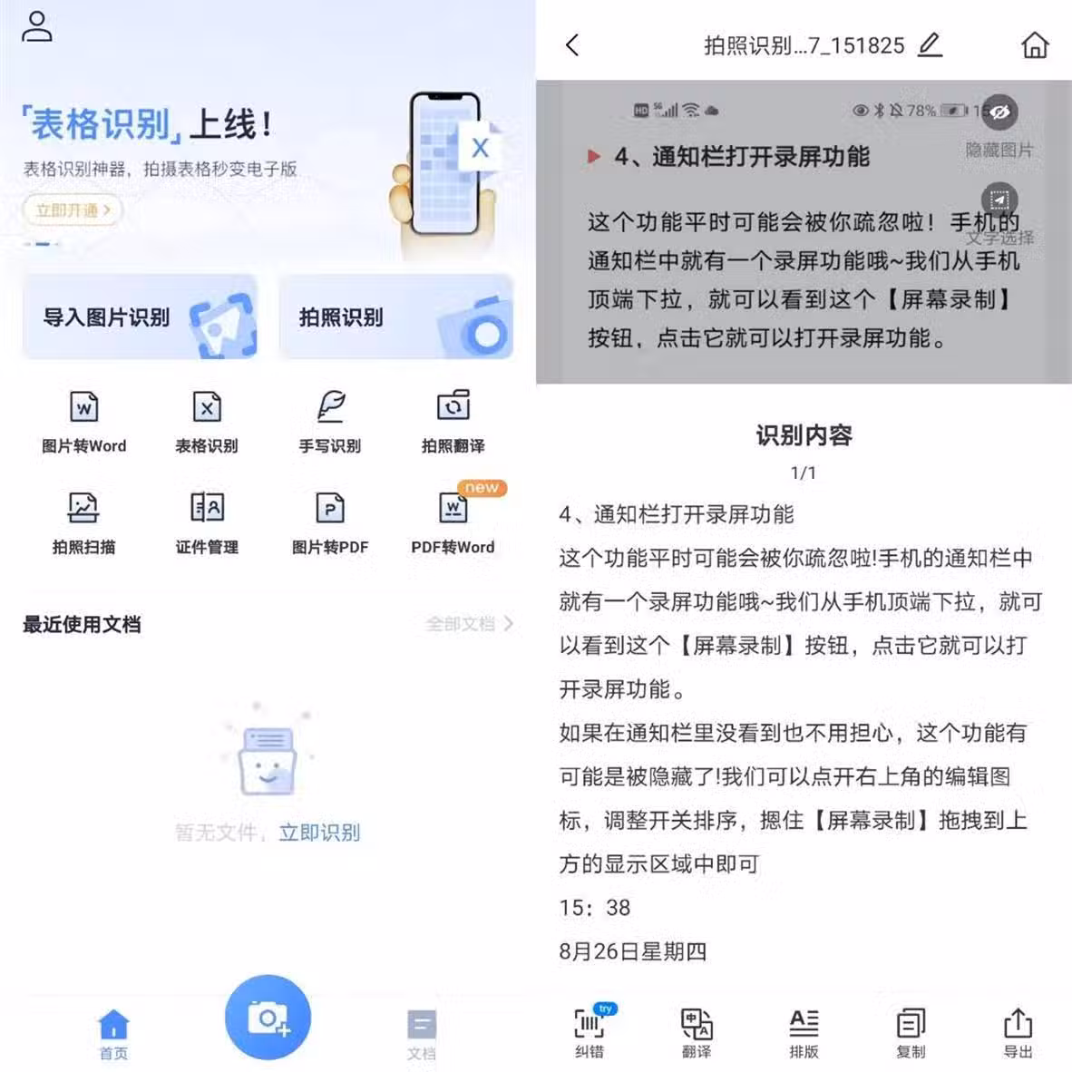但是這個功能較為可惜的一點是無法對文檔進行識別,如果有需要的話,小編推薦你試試使用迅捷文字識別APP。這款軟體可以將圖片轉Word,還可以識別手寫圖片、拍照翻譯等,非常實用。