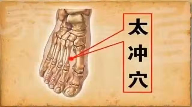 太沖穴位於足背側,第一、二跖骨結合部之前凹陷處。點揉太沖穴,從太沖揉到行間穴。一來回為一拍,約做30拍,兩手同時點揉。每天按壓3次。合谷穴、太沖穴名為"四關",分別為手陽明大腸經、足厥陰之原穴。