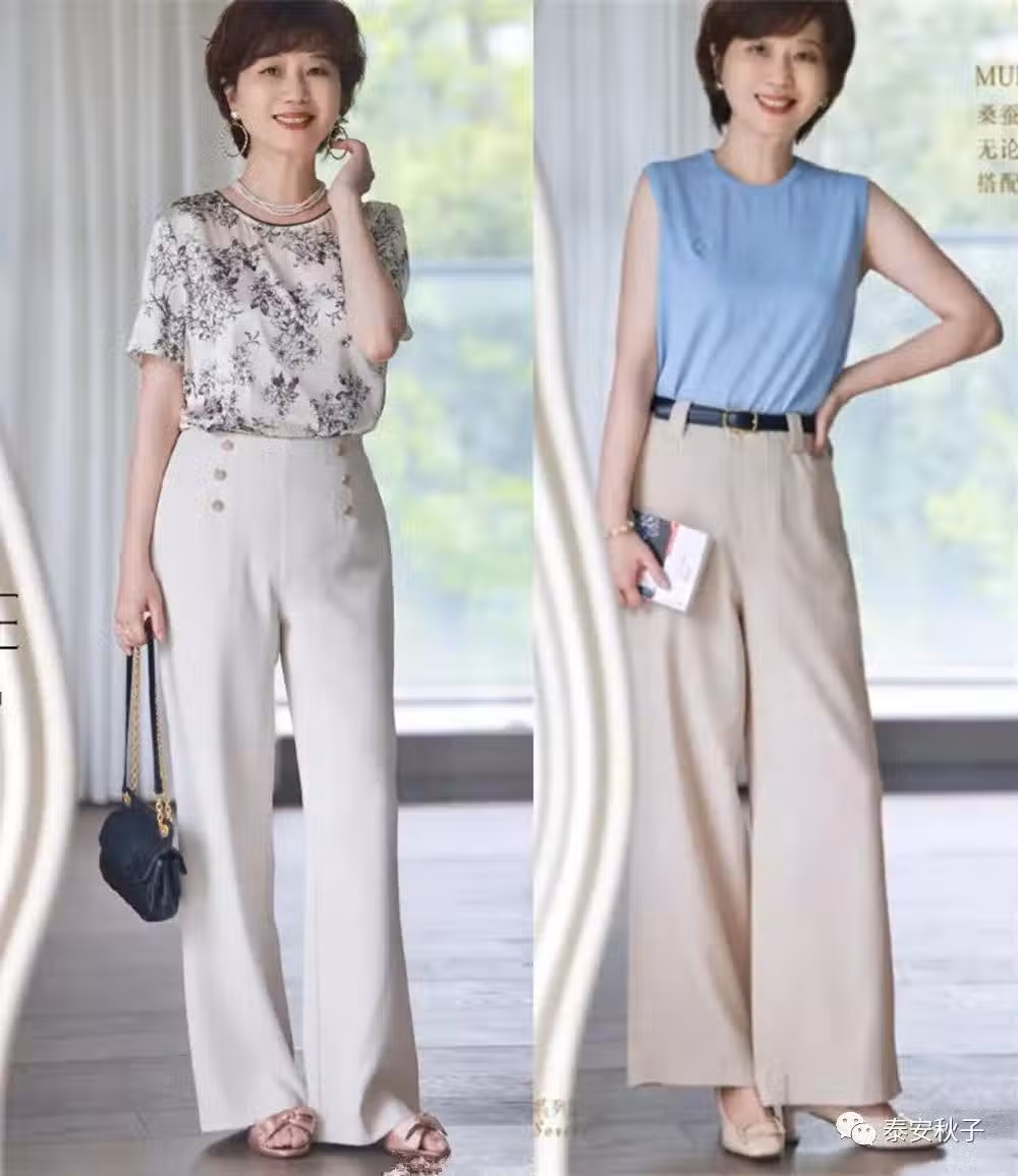 不挑身材、不挑腿型的高腰闊腿褲單品,是50+中年媽媽們用來凹造型的神器之一。