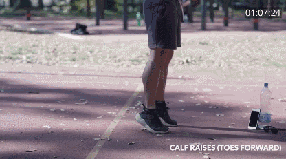 直立,雙手叉腰,雙腳分開與肩同寬 前腳掌著地,抬起後腳跟(可想像頭在用力向上頂) 抬到最大高度後,停留 2 秒,然後雙腳同時下落「擊地」 關鍵要點:足跟要有較明顯的震動、受力感 2、燃脂跺
