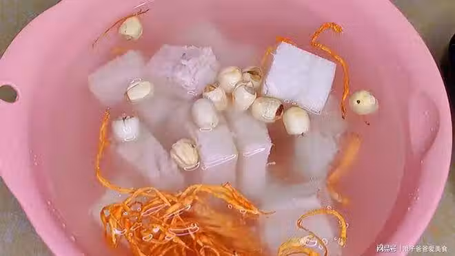 1. 今天燉一個葛根燉排骨湯,一塊葛根切成小塊放入砂鍋中,一把蟲草花清洗干凈,一小把蓮子進行簡單抓勻清洗,清洗好了直接倒入砂鍋中,加入適量的水。