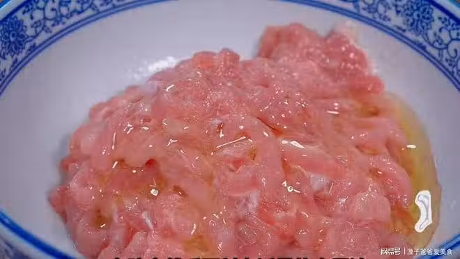 2. 把處理好的蒜苔放進大盆中,加入多一點的清水,把蒜苔泡幾分鐘,再準備一塊豬裡脊肉,給它切成肉絲,放進碗中,入一勺食鹽,半勺的白鬍椒粉,一勺黃酒,給它抓均勻,打入一顆蛋清,一勺生粉,適量的食用油,抓勻以後放在一邊備用。