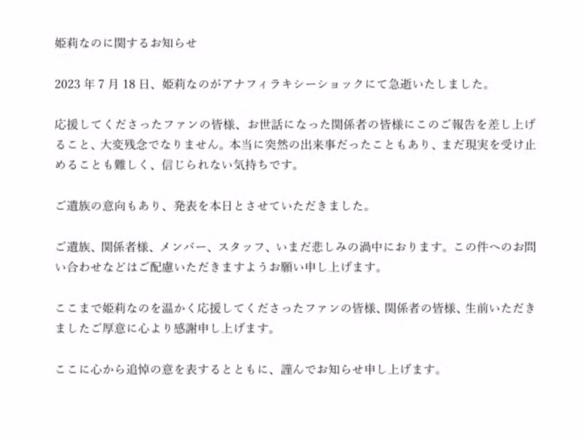 PrinceCHU!的其他團員也紛紛發文哀悼:「一切都太突然,至今還無法接受,一起活動的3個月時間很開心,安息」、「我們得知消息的時候也嚇了一大跳,直到今天都覺得像是謊話般,對不起讓大家擔心了,我不會忘記跟菜乃一起工作的時間」,也疑似因為受到打擊而狀態不佳,宣布團體從7月19到31日間都將暫停活動,21日、23日、8月6日的活動也都全面取消,希望粉絲能予以諒解。