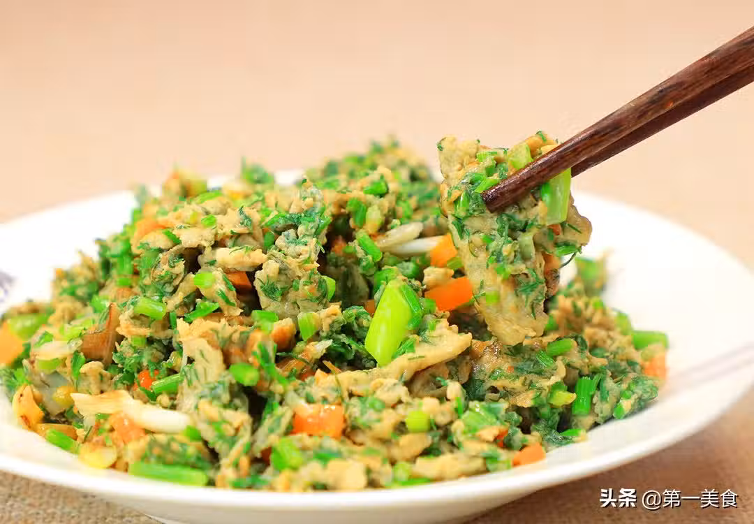1.在盆中打入五個雞蛋,加入食鹽2克入底味,倒入一點料酒去腥,用筷子攪散。準備小茴香一把,清洗乾淨切成碎粒,和雞蛋放在一起,攪拌均勻備用。