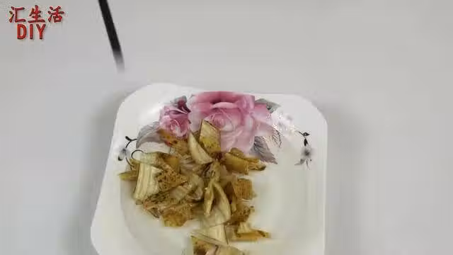 我也把香蕉皮切一下,把香蕉皮切碎就可以,切得越小越好,因為香蕉皮本身就有一種味道發甜的味道,這樣蟑螂自然會跑到香蕉皮上來,我們把香蕉皮切完之後然後準備一個盤子,把香蕉皮放在盤子裡邊兒,這時我們在盤子裡邊兒倒入一點清水,沒過香蕉皮就可以了,