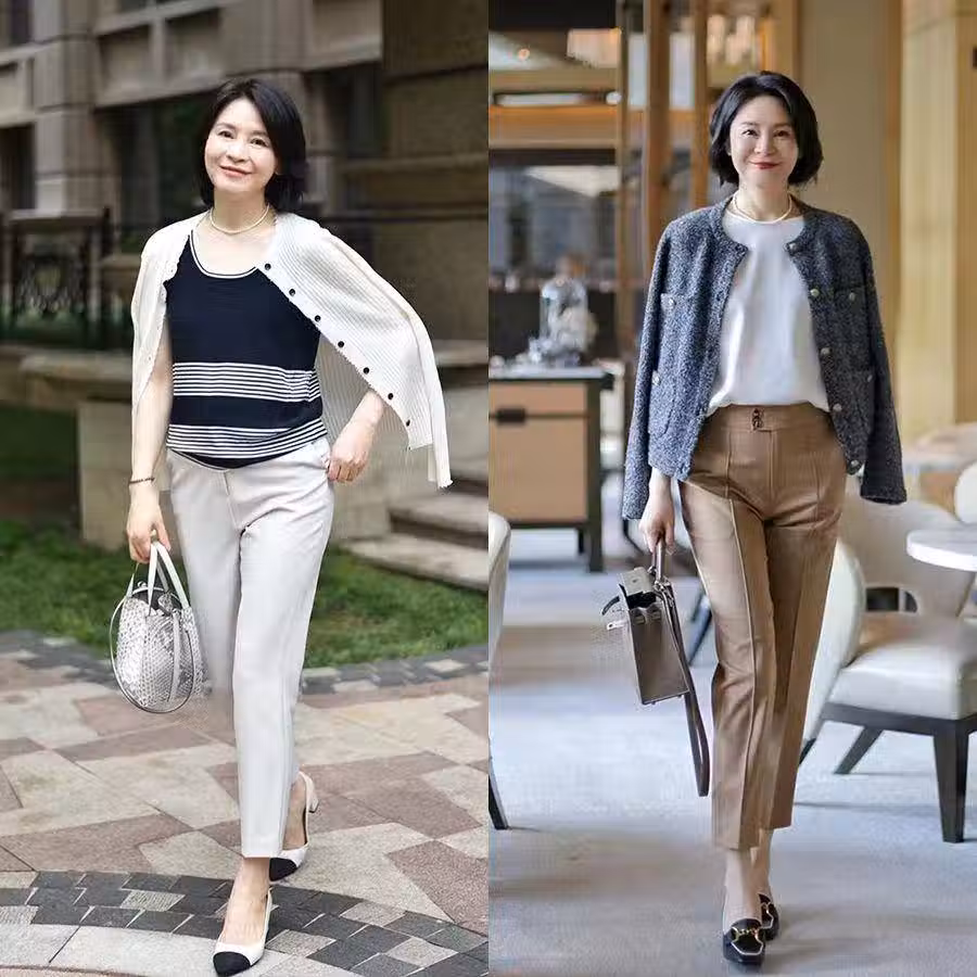 八分褲在中年女人的日常生活中還是比較常見的,它泛指的是運用八分褲長設計的褲子款式。這類褲子的長度恰好控制在中年女人的小腿到腳踝之間,尤其能夠強調出中年女人纖細的腳腕線條,拉長中年女人視覺上的腿長,進而優化中年女人的身材比例。