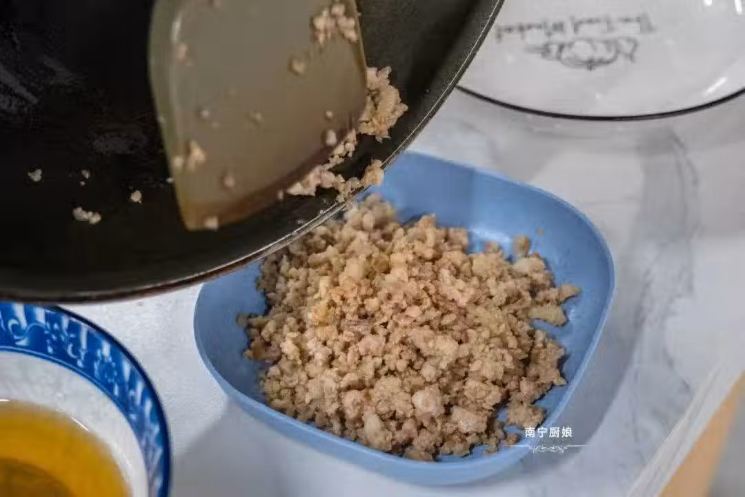 4.蒜粒煸出香味後下入腌好的肉末,一直炒到肉末變色,然後盛出備用。