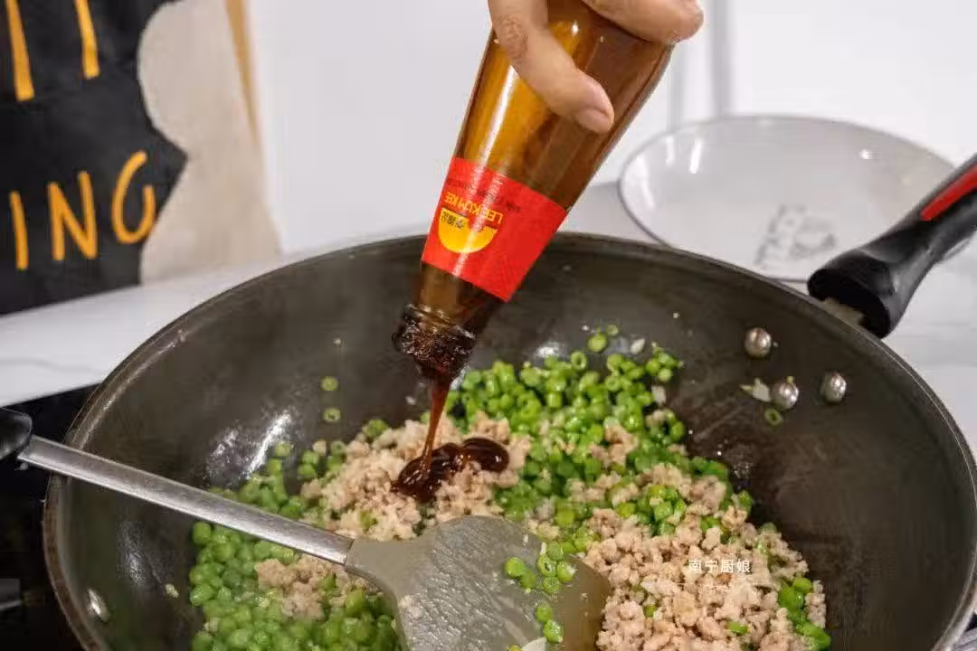 6.豆角斷生後下入剛剛炒好的肉末,加入蠔油、生抽、老抽開中火不斷翻炒均勻上色,把兌好的水澱粉倒入勾芡,小火1分鐘後收汁即可出鍋。