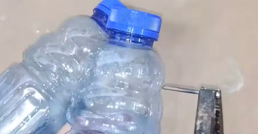 把它給裝好了之後,我們需要在上半部分給它開出來小孔,這樣子有利於涼氣透出來呀,我們給它裝上冰塊之後,找一個鉚釘或者說鐵釘,我們用這個打火機噴槍給它加熱之後,把這個瓶子上半部分給它扎出來小孔,像這種效果我們給它弄出來一個一個的小孔。