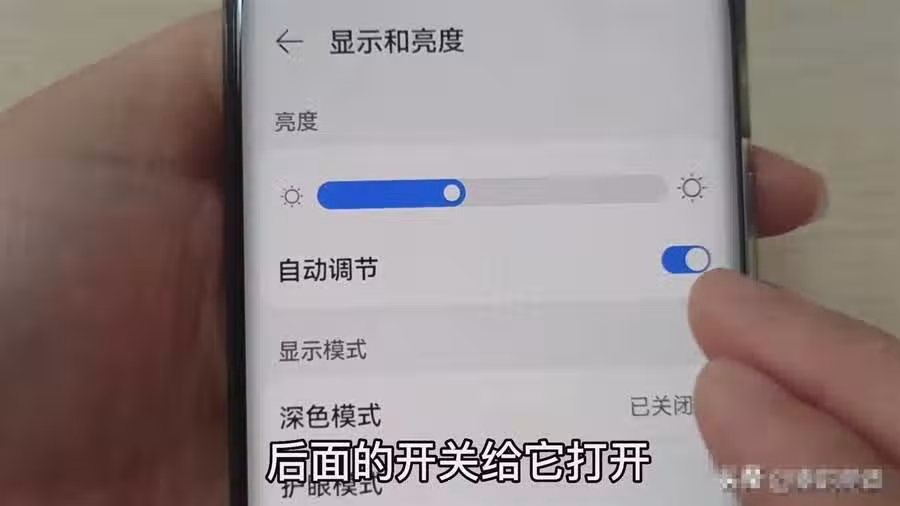 我們要把這個自動調節後面的開關給他打開,這樣的話那麼在陽光下手機就會自動調節亮度。