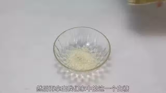 然後再拿出我們家中的這一個白糖,我們挖取一勺放入這個容器中,