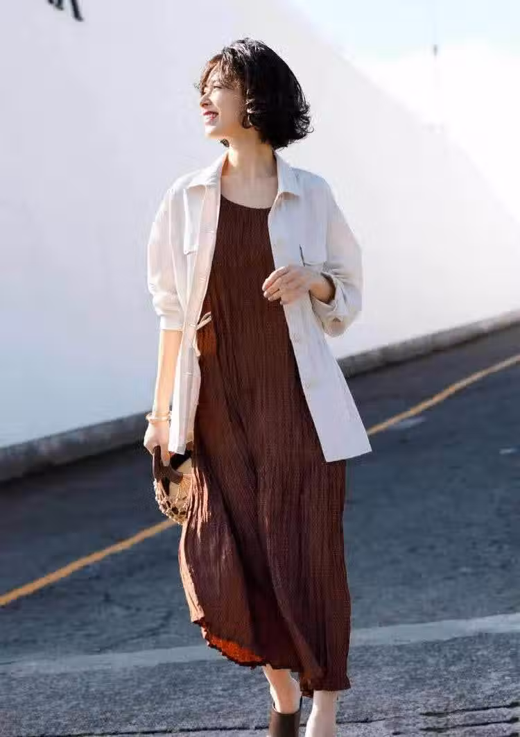 相信你肯定知道三宅一生家的特殊面料,這類帶著皺褶的面料因彈性佳穿起來很顯瘦,選擇H型的連衣裙型就能達到遮肚子贅肉顯瘦的目的,並且長度也是到腳踝的位置,縱向線條沒有遭到破壞,內搭一體色,再用工裝風襯衫外套瀟灑點綴,特適合初夏。