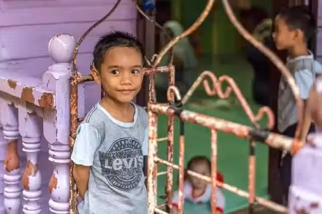 孩童在小巷子裡玩耍,略帶羞澀,目光清澈。