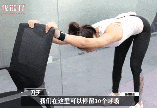 動作過程中如果大腿後側非常拉開,就可以把雙膝蓋一點點伸直,讓坐骨與腳後跟正對一條直線。注意不要讓手肘超伸過多,可微微彎曲手肘,以保持椅子的穩定性。