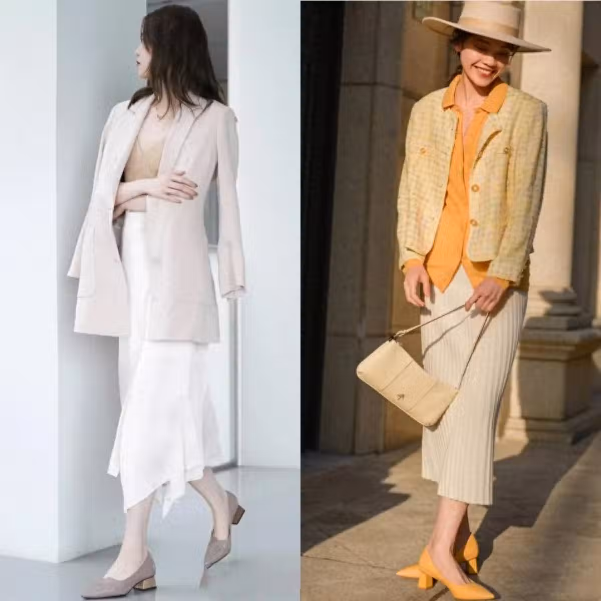 但若是想要打造出更加休閑舒適的造型,則可以嘗試下圖中的這種選用了粗跟設計的奶奶鞋款式。粗跟的設計穩定性更強,降低了崴腳的尷尬,也能適當提升舒適度。