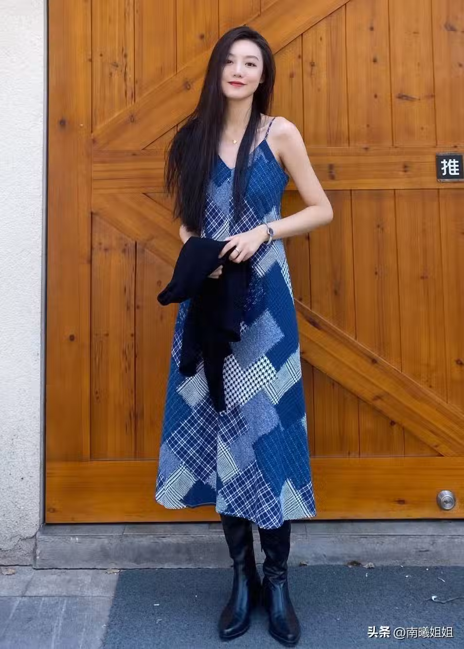 如果牛仔靴的顏色比較基礎簡約,那麼仙女裙的色彩就可以帶點設計感,像這種藍色系的拼接吊帶裙,穿在身上就非常時髦復古,而且頗有一種颯爽帥氣的風范兒。