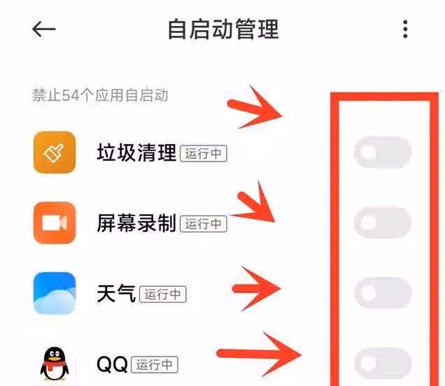 打開之後啊,就可以看到我們手機上面所有自動啟動的軟體了,那麼此時呢,我們在這邊找到不需要自啟動的軟體,然後把它們全部關掉就可以了,關閉之後,手機就不會出現卡頓和電量不耐用的問題了!