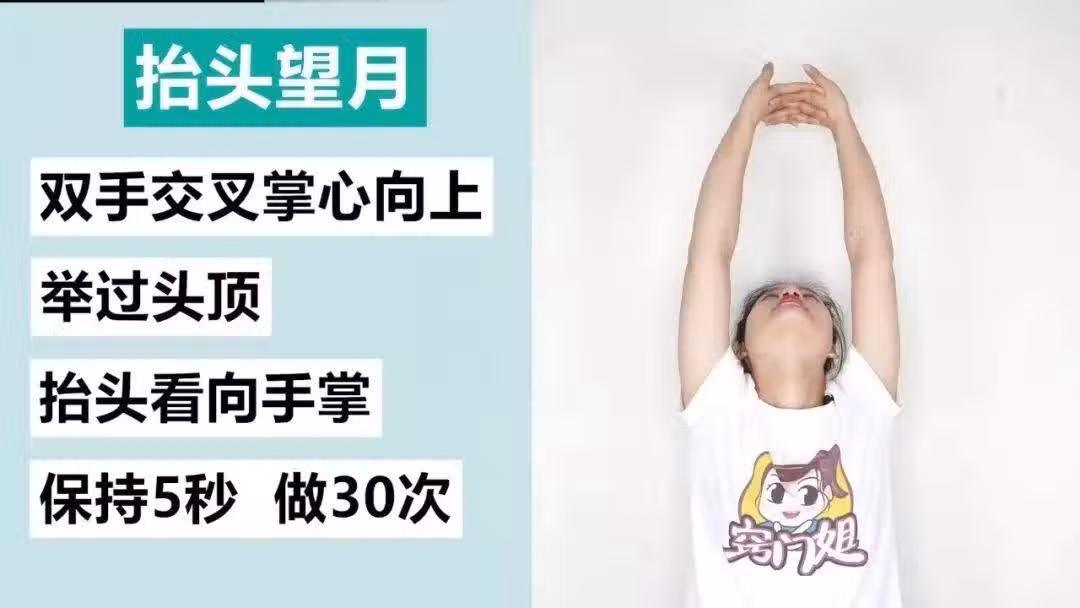 雙手交叉掌心向上,舉過頭頂,抬頭看向手掌,保持5秒做30次