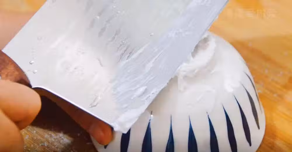 接著回到主題,待我們磨好後,上面的一些污垢也基本脫落下來了,這時候我們再拿出一塊擦腳布,將上面的牙膏給它擦掉,就直接擦乾凈就好,像這樣處理過的刀,還有一股淡淡的牙膏清香,也不會有之前用時的腥味。 這時再看看就覺得它已經很鋒利了。之後呢,我們再拿出一塊肉來試試它的鋒利。估計不用我說,只要大家試過以後,都會看到肉迎刃而解,而且切口也是非常的平整。