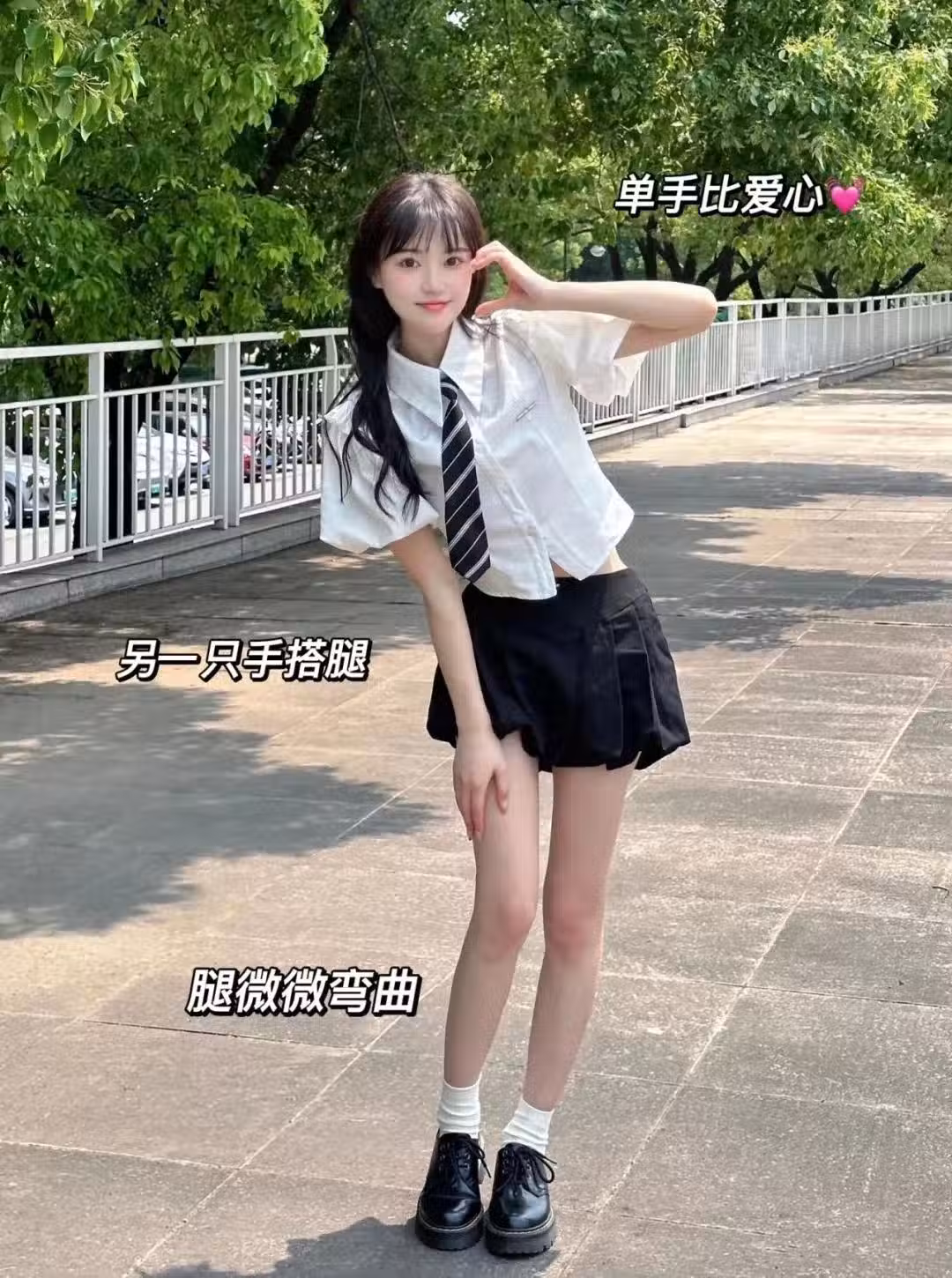 彎腰屈膝看鏡頭,與鏡頭互動起來,有效拉近了模特與觀眾的距離,想要拍得更有柔美一些的話,可以學下面的模特,單手比愛心,控制好表情管理,出片基本都不會差。