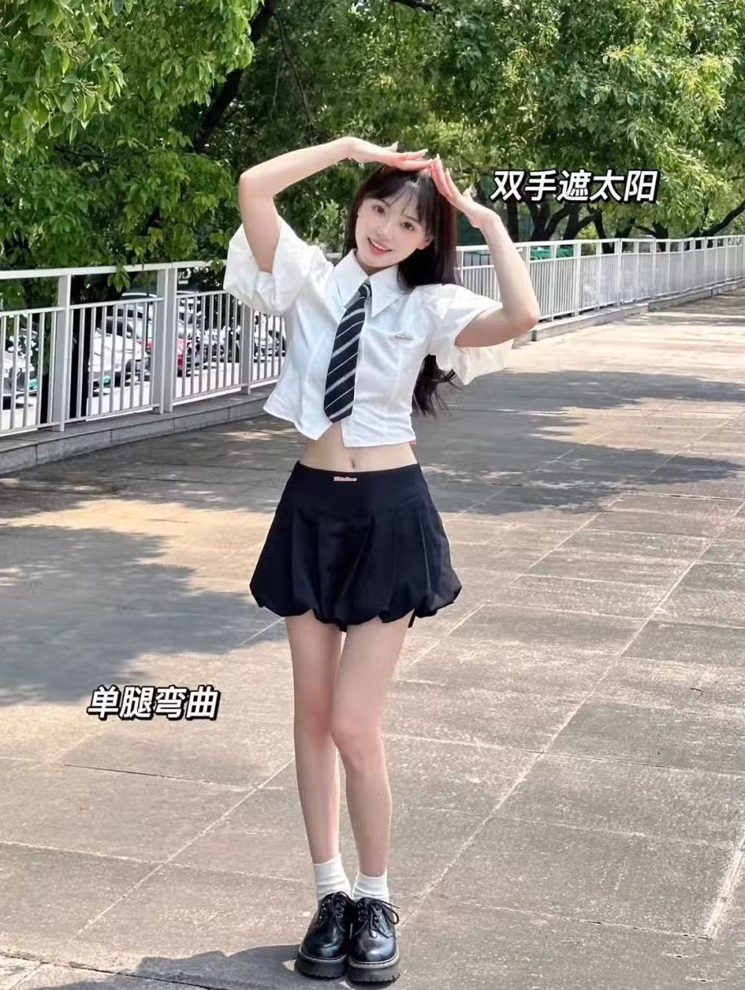拍攝外景的站姿全身照,建議搭配上雙手遮太陽的姿勢,一來能避免強光造成的面部表情不自然,二來也能拍到好看的手部線條,拍出站姿全身照的十足立體感。