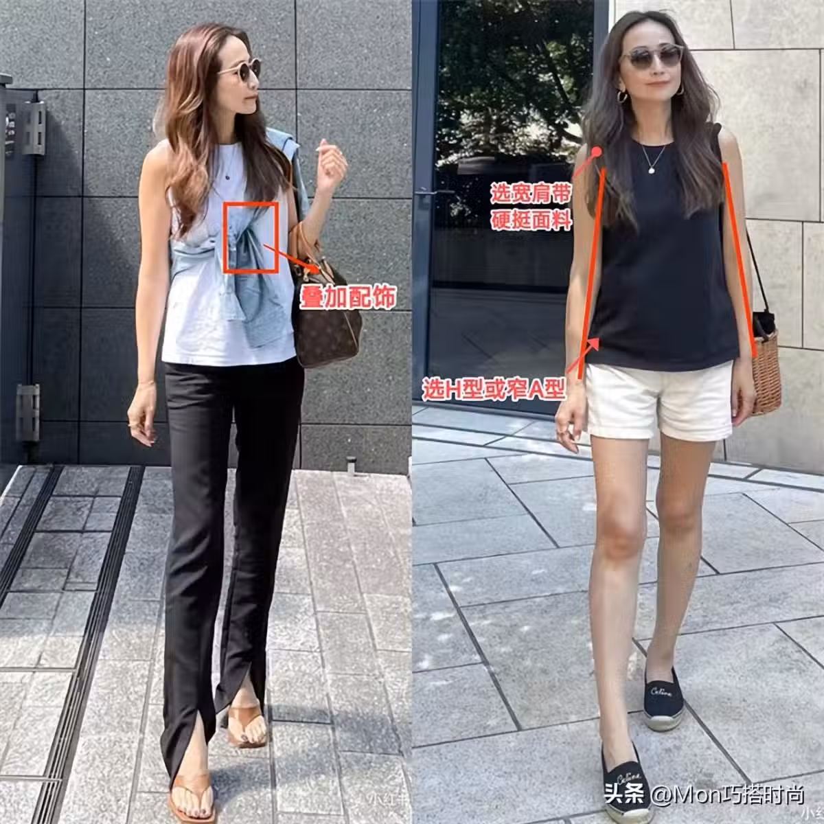 但選款時得注意,稍寬鬆的H型和窄A型直線剪裁+寬肩帶、偏硬挺的面料才會讓無袖背心變得百搭又減齡。還可疊加開衫、項鏈等小配飾呢~