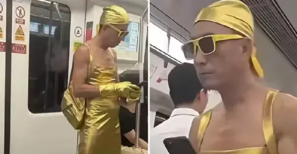 捷運上巧遇一位「金色弔帶裙大叔」超搶眼!捷運變秀場,不料仔細看去「眾人笑不出來了」