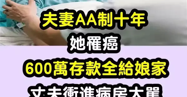 夫妻AA制十年!她罹癌「600萬存款全給娘家」丈夫衝進病房大罵 辦完身後事「他突收一封簡訊」崩潰了!