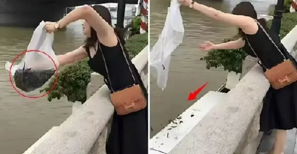 路邊看到女子在河邊搞「放生」黑乎乎一大袋,走進看清後:人在前面跑,魂在後面追!