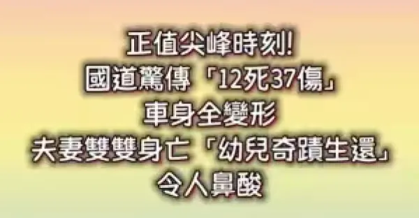 快訊/正值尖峰時刻!國道驚傳「12死37傷」車身全變形 夫妻雙雙身亡「幼兒奇蹟生還」令人鼻酸!