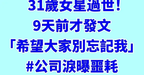 午間快訊/31歲女星過世!9天前才發文「希望大家別忘記我」!
