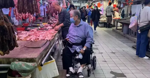 75歲洪金寶在香港,坐輪椅去菜市場,買了一塊豬肉,全程親力親為