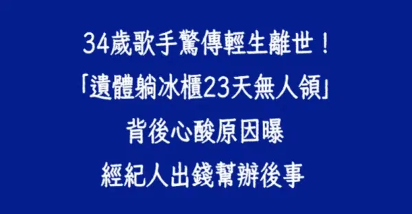 34歲歌手驚傳輕生離世!「遺體躺冰櫃23天無人領」背後心酸原因曝 經紀人出錢幫辦後事